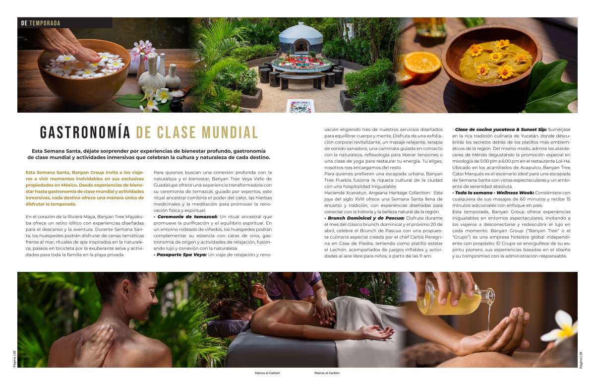 vación eligiendo tres de nuestros servicios diseñados para equilibrar cuerpo y mente. Disfruta de una exfoliación corporal revitalizante, un masaje relajante, terapia de sonido sanadora, una caminata guiada en contacto con la naturaleza, reflexología para liberar tensiones o una clase de yoga para restaurar tu energía. Tú eliges, nosotros nos encargamos del resto. Para quienes prefieren una escapada urbana, Banyan Tree Puebla fusiona la riqueza cultural de la ciudad con una hospitalidad inigualable. Hacienda Xcanatun, Angsana Heritage Collection: Esta joya del siglo XVIII ofrece una Semana Santa llena de encanto y tradición, con experiencias diseñadas para conectar con la historia y la belleza natural de la región.- Brunch Dominical y de Pascua: Disfrute durante el mes del clásico brunch dominical y el próximo 20 de abril, celebre el Brunch de Pascua con una propuesta culinaria especial creada por el chef Carlos Peregrina en Casa de Piedra, teniendo como platillo estelar el Lechón, acompañados de juegos inflables y actividades al aire libre para niños, a partir de las 11 am.