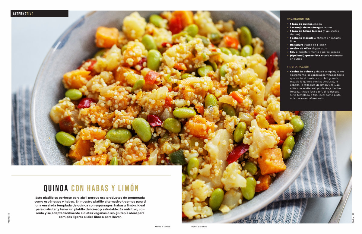Cocina la quinoa y déjala templar; saltea ligeramente los espárragos y habas hasta que estén al dente; en un bol grande, mezcla la quinoa con las verduras, la cebolla, la ralladura de limón y el jugo; aliña con aceite, sal, pimienta y hierbas frescas. Añade feta o tofu si lo deseas. Sirve templado o frío, ideal como plato único o acompañamiento.