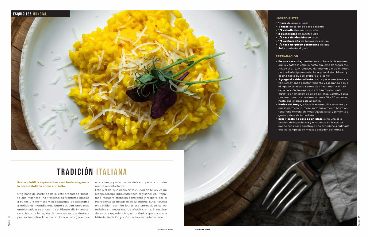 En una cacerola, derrite una cucharada de mantequilla y sofríe la cebolla hasta que esté transparente. Añade el arroz y remueve durante un par de minutos para sellarlo ligeramente. Incorpora el vino blanco y cocina hasta que se evapore el alcohol. Agrega el caldo caliente poco a poco, una taza a la vez, removiendo constantemente y esperando a que el líquido se absorba antes de añadir más. A mitad de la cocción, incorpora el azafrán previamente disuelto en un poco de caldo caliente. Continúa este proceso durante aproximadamente 18 a 20 minutos, hasta que el arroz esté al dente. Retira del fuego, añade la mantequilla restante y el queso parmesano, mezclando suavemente hasta obtener una textura cremosa. Ajusta la sal y pimienta al gusto y sirve de inmediato. Este risotto no solo es un plato, sino una celebración de la paciencia y el cuidado en la cocina, donde cada paso construye una experiencia culinaria que ha conquistado mesas alrededor del mundo.