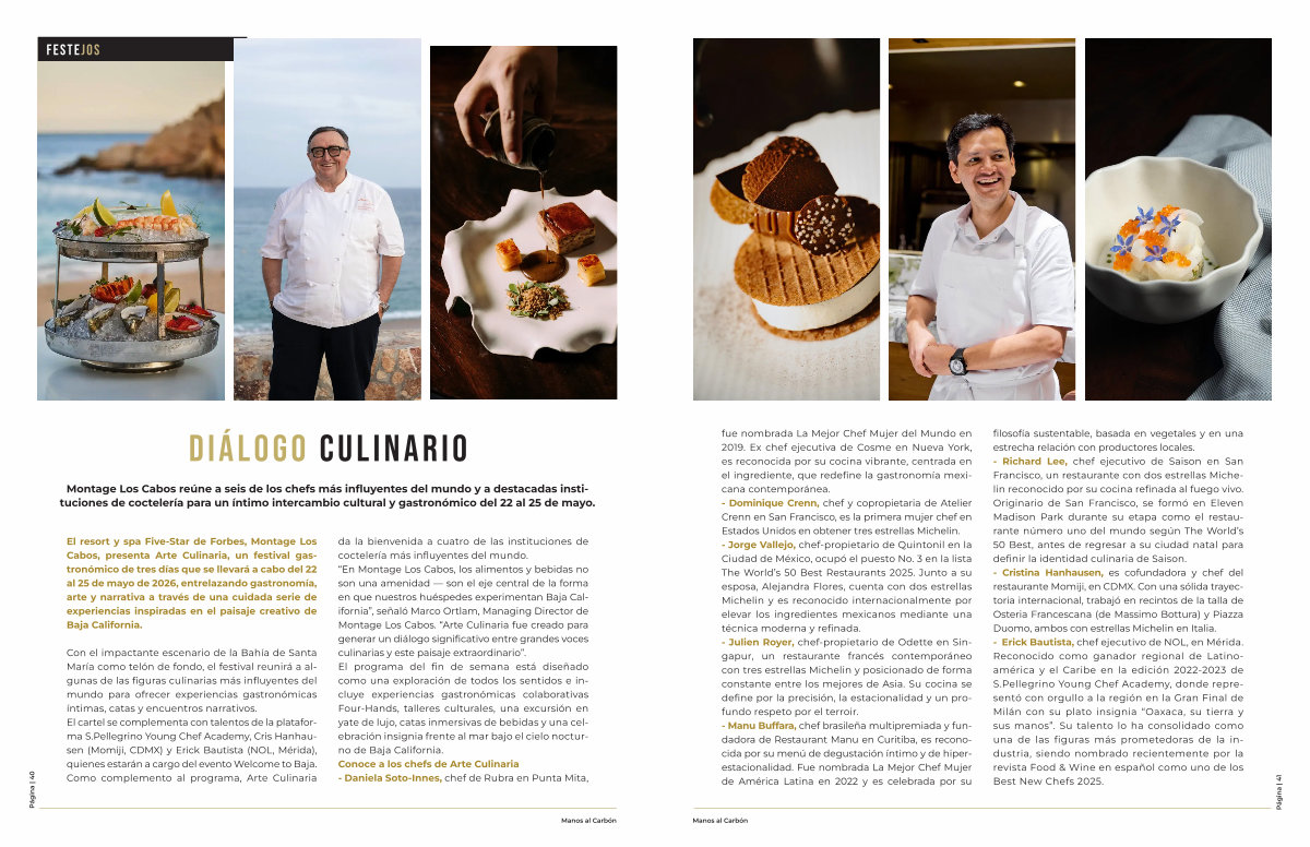 Con el impactante escenario de la Bahía de Santa María como telón de fondo, el festival reunirá a algunas de las figuras culinarias más influyentes del mundo para ofrecer experiencias gastronómicas íntimas, catas y encuentros narrativos. El cartel se complementa con talentos de la plataforma S. Pellegrino Young Chef Academy, Cris Hanhausen( Momiji, CDMX) y Erick Bautista( NOL, Mérida), quienes estarán a cargo del evento Welcome to Baja. Como complemento al programa, Arte Culinaria da la bienvenida a cuatro de las instituciones de coctelería más influyentes del mundo.“ En Montage Los Cabos, los alimentos y bebidas no son una amenidad— son el eje central de la forma en que nuestros huéspedes experimentan Baja California”, señaló Marco Ortlam, Managing Director de Montage Los Cabos.“ Arte Culinaria fue creado para generar un diálogo significativo entre grandes voces culinarias y este paisaje extraordinario”. El programa del fin de semana está diseñado como una exploración de todos los sentidos e incluye experiencias gastronómicas colaborativas Four-Hands, talleres culturales, una excursión en yate de lujo, catas inmersivas de bebidas y una celebración insignia frente al mar bajo el cielo nocturno de Baja California. Conoce a los chefs de Arte Culinaria- Daniela Soto-Innes, chef de Rubra en Punta Mita,