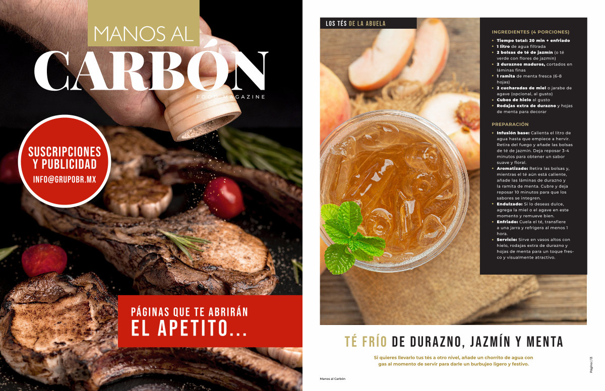 Tiempo total: 20 min + enfriado 1 litro de agua filtrada 2 bolsas de té de jazmín( o té verde con flores de jazmín) 2 duraznos maduros, cortados en láminas finas 1 ramita de menta fresca( 6-8 hojas) 2 cucharadas de miel o jarabe de agave( opcional, al gusto) Cubos de hielo al gusto Rodajas extra de durazno y hojas de menta para decorar