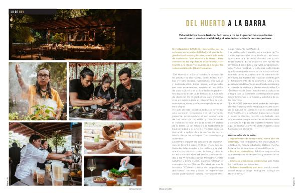 “ Del Huerto a la Barra ” celebra la riqueza de los productos del huerto , como flores , hierbas y frutos locales , fusionando creatividad y sostenibilidad . Estas series , compuestas por seis experiencias , respetarán los ciclos de cada cultivo y se utilizarán los ingredientes disponibles de cada temporada . Además de destacar los ingredientes , esta iniciativa crea un espacio para el intercambio de conocimientos , ideas y reflexiones profundas entre colegas . A través de esta iniciativa , se busca fomentar una conexión consciente con el momento presente , promoviendo el uso responsable de los recursos naturales y reconociendo el valor de lo local en cada creación detrás de la barra . Es un tributo a la herbolaria , la biodiversidad y el arte de mezclar sabores , invitando a redescubrir la esencia de la coctelería desde un enfoque más consciente y auténtico . La primera edición de esta serie de experiencias se llevará a cabo el 18 de enero con actividades relacionadas a los cultivos y la elaboración de bebidas como talleres y clínicas . En esta ocasión KANCHÉ tendrá como invitados a los mixólogos Joshua Monaghan , Peter Sánchez y China Furlan , quienes retoman el concepto de las Clínicas Clandestinas con la temática “ Cócteles clásicos con ingredientes del huerto ”. En esta y todas las experiencias estará participando Sandra Hernández , mixóloga residente en KANCHÉ . Los cultivos de traspatio en el estado de Yucatán representan una tradición ancestral que conecta a las comunidades con su entorno natural . Estos espacios son fuente de diversidad biológica y cultural , proporcionando frutas , hierbas , y especias autóctonas que forman parte esencial de la cocina local . Además de su importancia en la soberanía alimentaria , los huertos de traspatio contribuyen al fortalecimiento de la economía rural y a la preservación del conocimiento tradicional sobre el manejo de cultivos y plantas medicinales . En “ Del Huerto a la Barra ”, esta herencia cultural se integra con la coctelería contemporánea para rendir homenaje a la riqueza y sabiduría de estas prácticas . “ En KANCHÉ creemos en el poder de los ingredientes frescos y en la magia que ocurre cuando lo natural se combina con la creatividad . Con ‘ Del Huerto a la Barra ’, buscamos ofrecer a nuestros clientes no solo una bebida , sino una experiencia que conecta con la naturaleza y celebra la riqueza de nuestro entorno local aquí en Izamal ”, comentó Victor Azcorra , socio fundador de KANCHÉ .