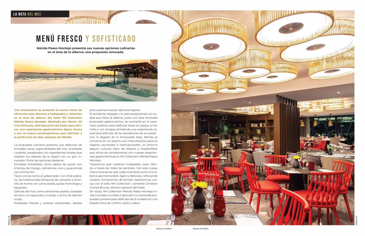 La propuesta culinaria presenta una selección de entradas, tacos, especialidades del mar, ensaladas y postres, preparados con ingredientes locales que resaltan los sabores de la región con un giro innovador. Entre las opciones destacan: Entradas irresistibles como dedos de queso con chutney de mango, camarones roca y guacamole con chicharrón. Tacos únicos como el gobernador con chile poblano, las tradicionales tempuras de camarón o la tortilla de harina con carne asada, queso manchego y aguacate. Delicias del mar como camarones asados, tostadas de atún con aguacate y mango, o el trío de salmón crudo. Ensaladas frescas y postres artesanales, ideales para quienes buscan opciones ligeras. El ambiente relajado y la vista excepcional a la ciudad que tiene la alberca, junto con esta renovada propuesta gastronómica, se convierte en el escenario perfecto para disfrutar tanto en pareja, en familia o con amigos, brindando una experiencia casual para disfrutar de los atardeceres de la ciudad. Con la llegada de la temporada baja, Mérida se convierte en un destino aún más atractivo para los viajeros nacionales e internacionales: un entorno seguro, cultural, lleno de historia y hospitalidad, que ahora se complementa con nuevas experiencias gastronómicas en NH Collection Mérida Paseo Montejo.“ Queremos que nuestros huéspedes vivan Mérida a través de todos los sentidos. Con este nuevo menú buscamos que cada momento junto a la alberca sea memorable, ligero y delicioso, reforzando nuestro compromiso de brindar experiencias únicas con el sello NH Collection”, comentó Christian Gomez Brunat, director general del hotel. Sin duda, NH Collection Mérida Paseo Montejo invita a locales y turistas a descubrir su renovada propuesta culinaria para disfrutar de la ciudad con una estadía llena de confort, estilo y sabor.
