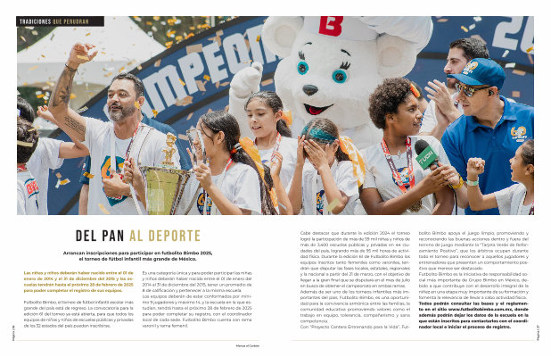 Cabe destacar que durante la edición 2024 el torneo logró la participación de más de 59 mil niñas y niños de más de 3,400 escuelas públicas y privadas en 44 ciudades del país , logrando más de 95 mil horas de actividad física . Durante la edición 61 de Futbolito Bimbo los equipos inscritos tanto femeniles como varoniles , tendrán que disputar las fases locales , estatales , regionales y la nacional a partir del 21 de marzo , con el objetivo de llegar a la gran final que se disputará en el mes de julio en busca de obtener el campeonato en ambas ramas . Además de ser uno de los torneos infantiles más importantes del país , Futbolito Bimbo , es una oportunidad para la convivencia armónica entre las familias , la comunidad educativa promoviendo valores como el trabajo en equipo , tolerancia , compañerismo y sana competencia . Con “ Proyecto Cantera Entrenando para la Vida ”, Futbolito Bimbo apoya el juego limpio , promoviendo y reconociendo las buenas acciones dentro y fuera del terreno de juego mediante la “ Tarjeta Verde de Reforzamiento Positivo ”, que los árbitros ocupan durante todo el torneo para reconocer a aquellos jugadores y entrenadores que presentan un comportamiento positivo que merece ser destacado . Futbolito Bimbo es la iniciativa de responsabilidad social más importante de Grupo Bimbo en México , debido a que contribuye con el desarrollo integral de la niñez en una etapa muy importante de su formación y fomenta la relevancia de llevar a cabo actividad física . Todos podrán consultar las bases y el reglamento en el sitio www . futbolitobimbo . com . mx , donde además podrán dejar los datos de la escuela en la que están inscritos para contactarlos con el coordinador local e iniciar el proceso de registro .