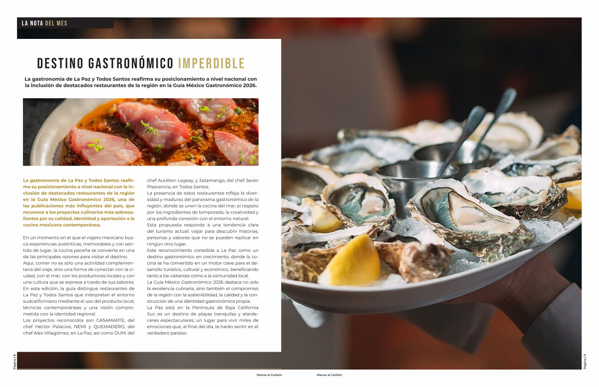 La gastronomía de La Paz y Todos Santos reafirma su posicionamiento a nivel nacional con la inclusión de destacados restaurantes de la región en la Guía México Gastronómico 2026, una de las publicaciones más influyentes del país, que reconoce a los proyectos culinarios más sobresalientes por su calidad, identidad y aportación a la cocina mexicana contemporánea.