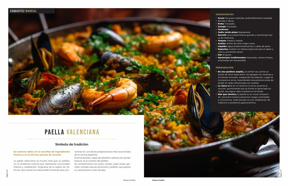En una paellera amplia, se sofríen las carnes en aceite de oliva hasta dorar. Se agregan las verduras y el tomate triturado, integrando los sabores. Luego se incorpora el arroz, mezclándolo brevemente antes de añadir el caldo infusionado con azafrán. La clave está en no remover el arroz durante la cocción, permitiendo que se forme el apreciado socarrat, esa ligera capa crujiente en el fondo. Más que técnica, la paella es un ritual compartido. Cocinarla implica paciencia, fuego controlado y convivencia. Cada bocado es una celebración de tradición y excelencia gastronómica.