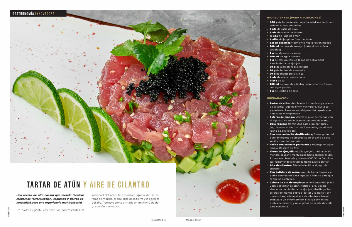Un plato elegante con texturas contrastantes: la suavidad del atún, la explosión líquida de las esferas de mango, el crujiente de la tierra y la ligereza del aire. Perfecto como entrada en un menú de degustación innovador.