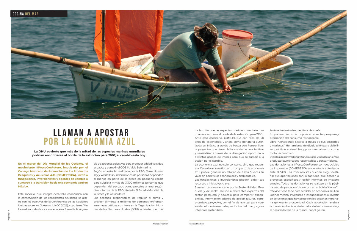 Fortalecimiento de colectivos de chefs: Empoderamiento de mujeres en el sector pesquero y promoción del consumo responsable. Libro“ Conociendo México a través de sus pescados y mariscos”: Herramienta de divulgación para visibilizar prácticas sostenibles y posicionar al sector como motor económico. Eventos de networking y fundraising: Vinculación entre productores, mercados responsables y consumidores. Las donaciones a # PescaConFuturo son deducibles de impuestos( COMEPESCA es donataria autorizada ante el SAT). Los inversionistas pueden elegir destinar sus aportaciones con la cantidad que deseen a proyectos específicos y recibir informes de impacto anuales. Todas las donaciones se realizan en la página web de pescaconfuturo. com en el botón“ donar”.” México tiene todo para ser líder en economía azul en Latinoamérica. Invitamos a las fundaciones a invertir en soluciones que hoy protegen los océanos y mañana generarán prosperidad. Cada aportación acelera la transición hacia un futuro donde la conservación y el desarrollo van de la mano”, concluyeron.