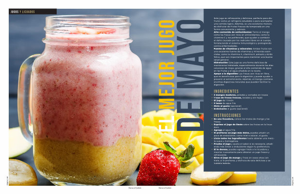 Página | 49 el mejor jugo de mayoEste jugo es refrescante y delicioso , perfecto para disfrutar como un refrigerio saludable o para acompañar una comida ligera . Además , es una excelente manera de disfrutar de frutas frescas de temporada en una forma conveniente y sabrosa . Alto contenido de antioxidantes : Tanto el mango como las fresas son ricos en antioxidantes , como la vitamina C y los polifenoles , que ayudan a combatir el daño causado por los radicales libres en el cuerpo , fortaleciendo el sistema inmunológico y protegiendo contra enfermedades . Fuente de vitaminas y minerales : Ambas frutas son una excelente fuente de vitaminas y minerales esenciales , como la vitamina A , vitamina K , potasio y ácido fólico , que son importantes para mantener una buena salud general . Hidratación : Este jugo es una forma deliciosa de mantenerse hidratado , especialmente durante los días calurosos de mayo , gracias al alto contenido de agua en las frutas y el agua añadida en la receta . Apoyo a la digestión : Las fresas son ricas en fibra , que es beneficiosa para la digestión y puede ayudar a prevenir el estreñimiento . Además , el mango contiene enzimas digestivas naturales que pueden facilitar la digestión .