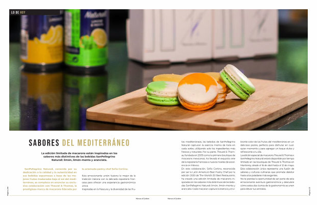tas mediterráneas , las bebidas de SanPellegrino Naturali capturan la esencia misma de Italia en cada sorbo , utilizando solo los ingredientes más frescos y naturales . Por su parte , Theurel & Thomas , fundada en 2009 como la primera boutique de macarons mexicanos , ha llevado el exquisito arte de la repostería francesa a nuevos niveles de excelencia en México . En esta colaboración , Sofía Cortina , reconocida por ser la Latin America ’ s Best Pastry Chef por la edición 2020 de The World ’ s 50 Best Restaurants , ha creado una edición limitada de macarons inspirados en los sabores más distintivos de las bebidas SanPellegrino Naturali : limón , limón-menta y aranciata . Cada macaron captura la esencia y el vibrante color de las frutas del mediterráneo en un delicioso postre , perfecto para disfrutar en cualquier momento y para agregar un toque dulce y refrescante a tu día . La edición especial de macarons Theurel & Thomas x SanPellegrino Naturali estará disponible por tiempo limitado en las boutiques de Theurel & Thomas en Monterrey , desde el 16 de abril hasta el 12 de mayo . Esta colaboración única representa una fusión de sabores y culturas culinarias que promete deleitar hasta a los paladares más exigentes . No te pierdas la oportunidad de ser parte de esta emocionante aventura gastronómica y descubre cómo estos dos íconos de la gastronomía se unen para elevar tus sentidos .