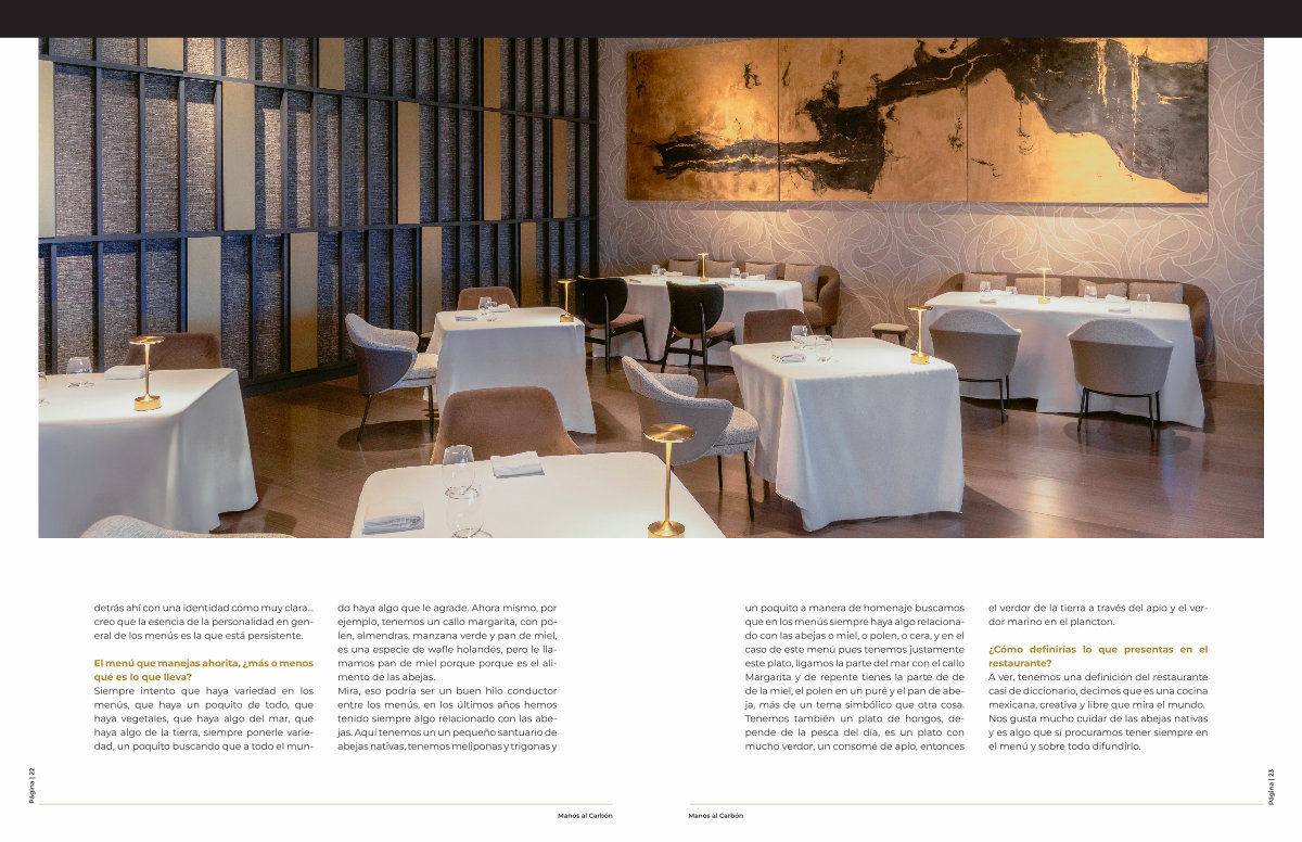 ¿ Cómo definirías lo que presentas en el restaurante? A ver, tenemos una definición del restaurante casi de diccionario, decimos que es una cocina mexicana, creativa y libre que mira el mundo. Nos gusta mucho cuidar de las abejas nativas y es algo que sí procuramos tener siempre en el menú y sobre todo difundirlo.
