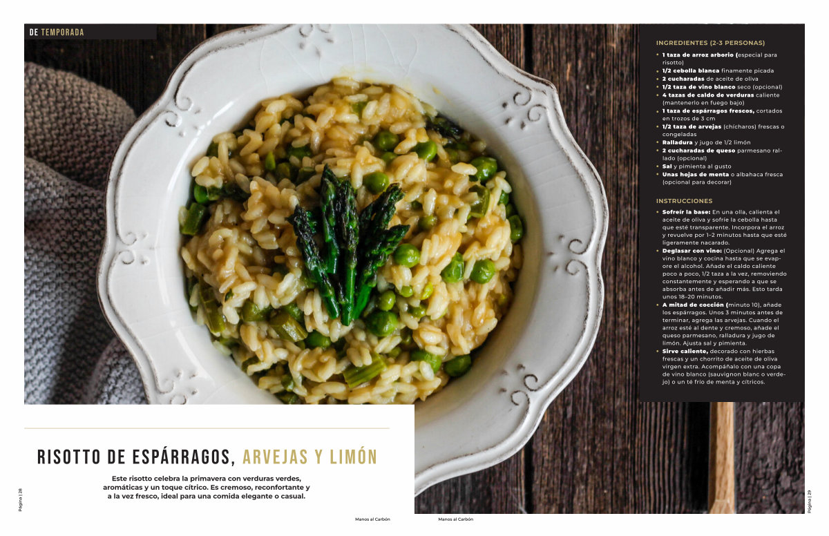 Sofreír la base: En una olla, calienta el aceite de oliva y sofríe la cebolla hasta que esté transparente. Incorpora el arroz y revuelve por 1 – 2 minutos hasta que esté ligeramente nacarado. Deglasar con vino:( Opcional) Agrega el vino blanco y cocina hasta que se evapore el alcohol. Añade el caldo caliente poco a poco, 1 / 2 taza a la vez, removiendo constantemente y esperando a que se absorba antes de añadir más. Esto tarda unos 18 – 20 minutos. A mitad de cocción( minuto 10), añade los espárragos. Unos 3 minutos antes de terminar, agrega las arvejas. Cuando el arroz esté al dente y cremoso, añade el queso parmesano, ralladura y jugo de limón. Ajusta sal y pimienta. Sirve caliente, decorado con hierbas frescas y un chorrito de aceite de oliva virgen extra. Acompáñalo con una copa de vino blanco( sauvignon blanc o verdejo) o un té frío de menta y cítricos.
