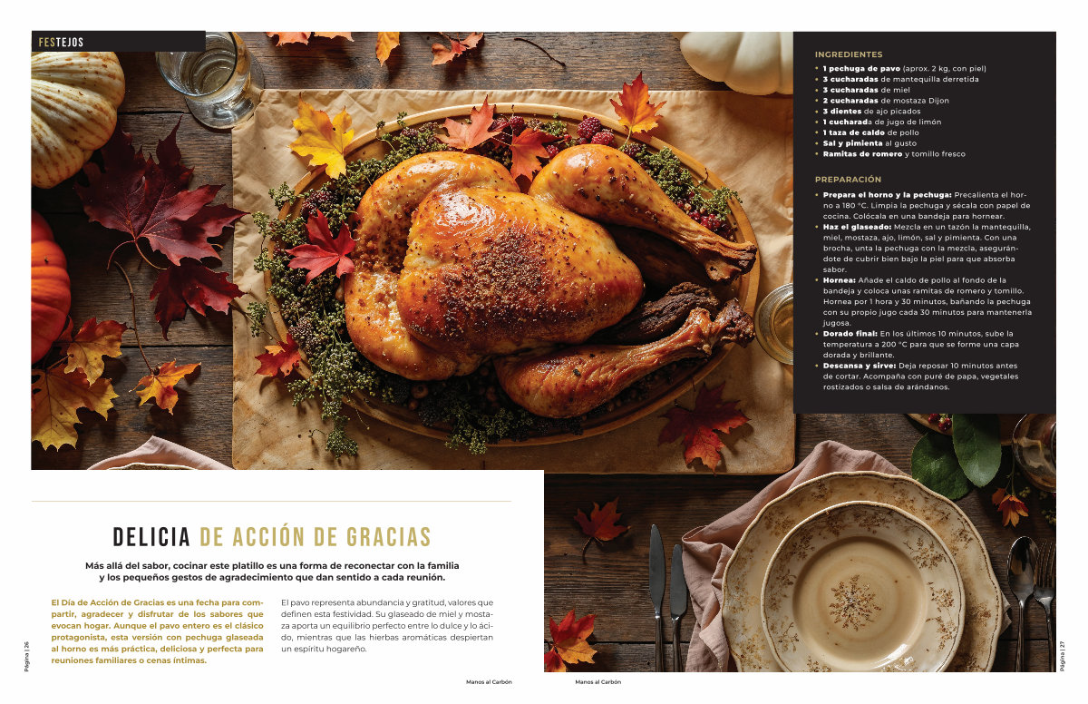 Prepara el horno y la pechuga: Precalienta el horno a 180 ° C. Limpia la pechuga y sécala con papel de cocina. Colócala en una bandeja para hornear. Haz el glaseado: Mezcla en un tazón la mantequilla, miel, mostaza, ajo, limón, sal y pimienta. Con una brocha, unta la pechuga con la mezcla, asegurándote de cubrir bien bajo la piel para que absorba sabor. Hornea: Añade el caldo de pollo al fondo de la bandeja y coloca unas ramitas de romero y tomillo. Hornea por 1 hora y 30 minutos, bañando la pechuga con su propio jugo cada 30 minutos para mantenerla jugosa. Dorado final: En los últimos 10 minutos, sube la temperatura a 200 ° C para que se forme una capa dorada y brillante. Descansa y sirve: Deja reposar 10 minutos antes de cortar. Acompaña con puré de papa, vegetales rostizados o salsa de arándanos.
