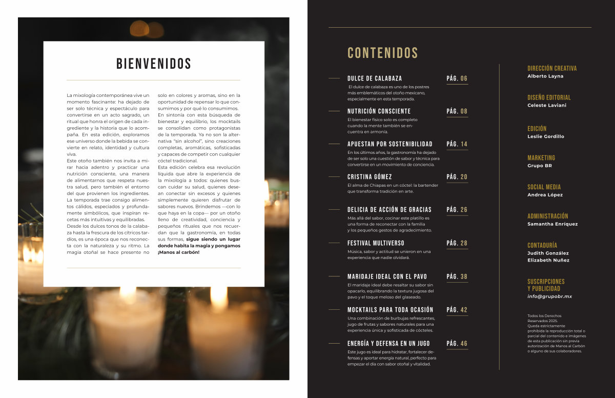 La mixología contemporánea vive un momento fascinante: ha dejado de ser solo técnica y espectáculo para convertirse en un acto sagrado, un ritual que honra el origen de cada ingrediente y la historia que lo acompaña. En esta edición, exploramos ese universo donde la bebida se convierte en relato, identidad y cultura viva. Este otoño también nos invita a mirar hacia adentro y practicar una nutrición consciente, una manera de alimentarnos que respeta nuestra salud, pero también el entorno del que provienen los ingredientes. La temporada trae consigo alimentos cálidos, especiados y profundamente simbólicos, que inspiran recetas más intuitivas y equilibradas. Desde los dulces tonos de la calabaza hasta la frescura de los cítricos tardíos, es una época que nos reconecta con la naturaleza y su ritmo. La magia otoñal se hace presente no solo en colores y aromas, sino en la oportunidad de repensar lo que consumimos y por qué lo consumimos. En sintonía con esta búsqueda de bienestar y equilibrio, los mocktails se consolidan como protagonistas de la temporada. Ya no son la alternativa“ sin alcohol”, sino creaciones completas, aromáticas, sofisticadas y capaces de competir con cualquier cóctel tradicional. Esta edición celebra esa revolución líquida que abre la experiencia de la mixología a todos: quienes buscan cuidar su salud, quienes desean conectar sin excesos y quienes simplemente quieren disfrutar de sabores nuevos. Brindemos— con lo que haya en la copa— por un otoño lleno de creatividad, conciencia y pequeños rituales que nos recuerdan que la gastronomía, en todas sus formas, sigue siendo un lugar donde habita la magia y pongamos ¡ Manos al carbón!