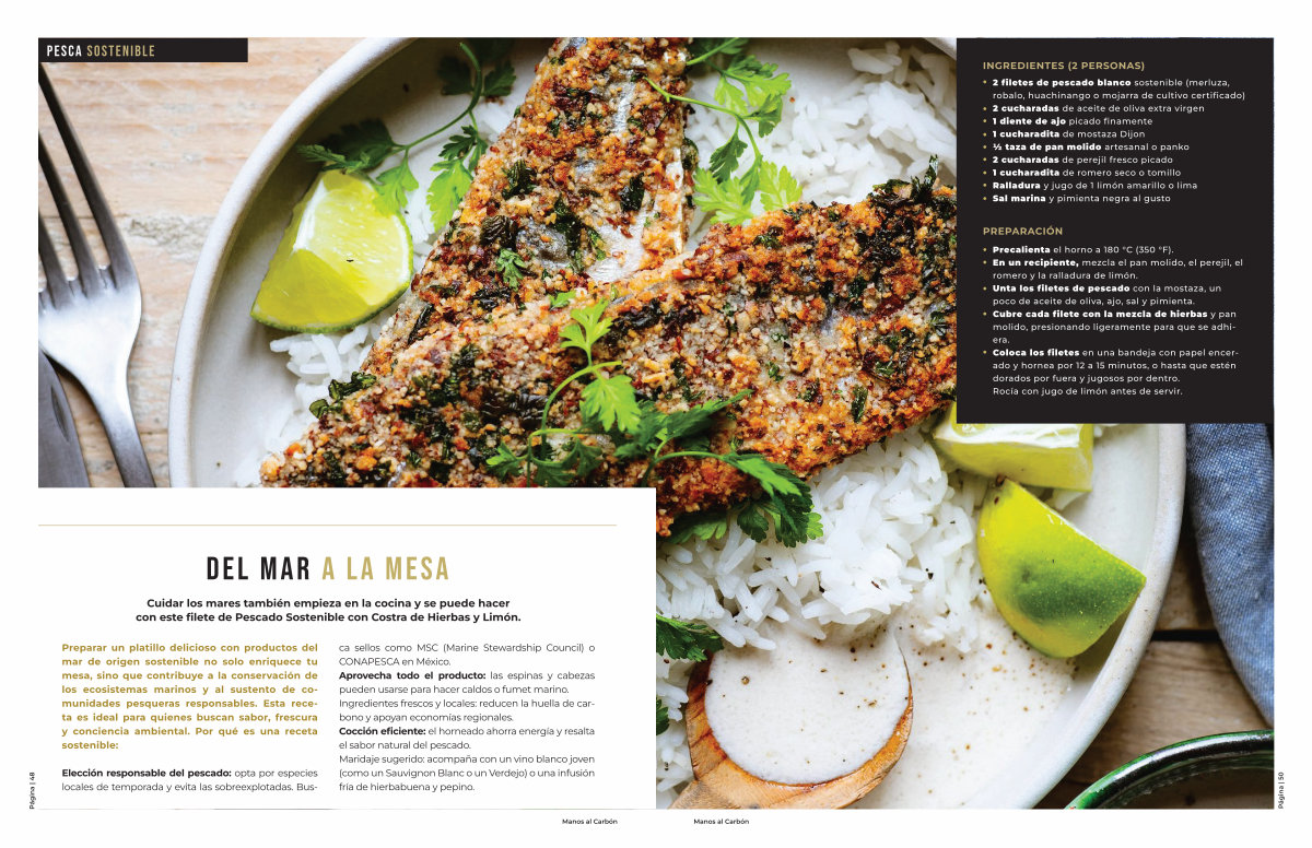 Elección responsable del pescado: opta por especies locales de temporada y evita las sobreexplotadas. Busca sellos como MSC( Marine Stewardship Council) o CONAPESCA en México. Aprovecha todo el producto: las espinas y cabezas pueden usarse para hacer caldos o fumet marino. Ingredientes frescos y locales: reducen la huella de carbono y apoyan economías regionales. Cocción eficiente: el horneado ahorra energía y resalta el sabor natural del pescado. Maridaje sugerido: acompaña con un vino blanco joven( como un Sauvignon Blanc o un Verdejo) o una infusión fría de hierbabuena y pepino.
