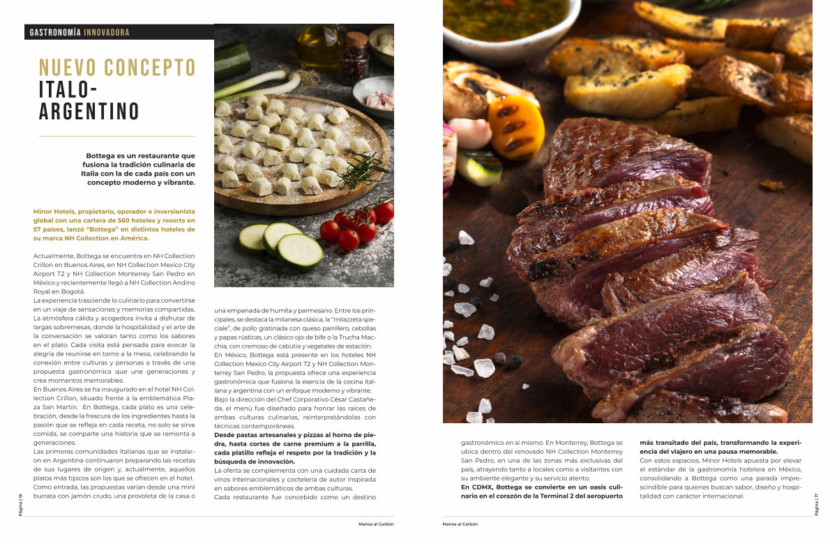 gastronómico en sí mismo. En Monterrey, Bottega se ubica dentro del renovado NH Collection Monterrey San Pedro, en una de las zonas más exclusivas del país, atrayendo tanto a locales como a visitantes con su ambiente elegante y su servicio atento. En CDMX, Bottega se convierte en un oasis culinario en el corazón de la Terminal 2 del aeropuerto más transitado del país, transformando la experiencia del viajero en una pausa memorable. Con estos espacios, Minor Hotels apuesta por elevar el estándar de la gastronomía hotelera en México, consolidando a Bottega como una parada imprescindible para quienes buscan sabor, diseño y hospitalidad con carácter internacional.