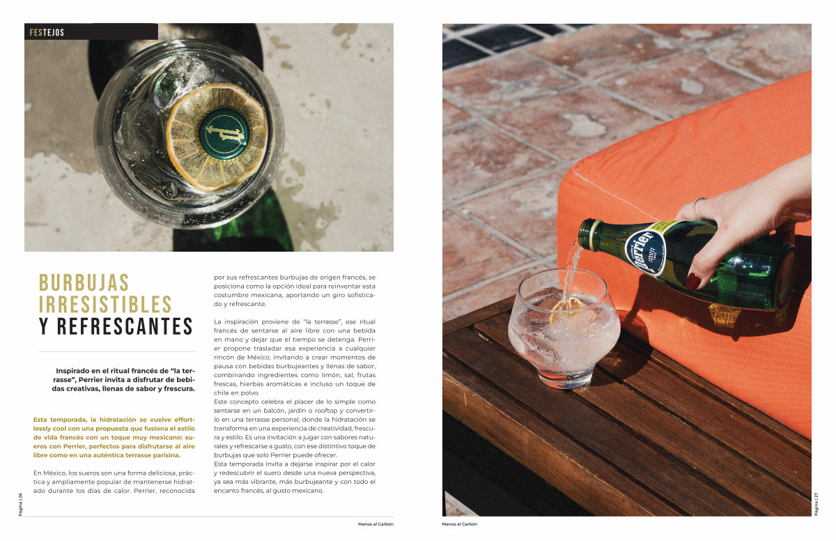 La inspiración proviene de“ la terrasse”, ese ritual francés de sentarse al aire libre con una bebida en mano y dejar que el tiempo se detenga. Perrier propone trasladar esa experiencia a cualquier rincón de México, invitando a crear momentos de pausa con bebidas burbujeantes y llenas de sabor, combinando ingredientes como limón, sal, frutas frescas, hierbas aromáticas e incluso un toque de chile en polvo. Este concepto celebra el placer de lo simple como sentarse en un balcón, jardín o rooftop y convertirlo en una terrasse personal, donde la hidratación se transforma en una experiencia de creatividad, frescura y estilo. Es una invitación a jugar con sabores naturales y refrescarse a gusto, con ese distintivo toque de burbujas que solo Perrier puede ofrecer. Esta temporada invita a dejarse inspirar por el calor y redescubrir el suero desde una nueva perspectiva, ya sea más vibrante, más burbujeante y con todo el encanto francés, al gusto mexicano.