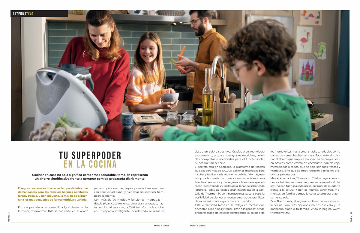 desde un solo dispositivo. Gracias a su tecnología todo-en-uno, preparar desayunos nutritivos, comidas completas o meriendas para el lunch escolar nunca fue tan sencillo. El secreto está en Cookidoo, la plataforma de recetas guiadas con más de 100,000 opciones diseñadas para inspirar y facilitar cada momento del día. Además, esta temporada cuenta con colecciones especiales como Lunches para niños y De regreso a la escuela, que ofrecen ideas variadas y fáciles para llenar de sabor cada lonchera. Todas las recetas están integradas en la pantalla de Thermomix, con instrucciones paso a paso, la posibilidad de planear el menú semanal, generar listas de súper automáticas y cocinar con precisión. Esta versatilidad también se refleja en recetas que encantan a los niños y tranquilizan a los papás: desde preparar nuggets caseros controlando la calidad de los ingredientes, hasta crear snacks saludables como barras de cereal hechas en casa. Todo esto sin olvidar el ahorro que implica elaborar en tu propia cocina básicos como crema de cacahuate, pan de caja, mermeladas o salsas, que no solo son más frescos y nutritivos, sino que además reducen gastos en productos procesados. Más allá de cocinar, Thermomix TM6 te regala tiempo de calidad. Por las mañanas, puedes compartir el desayuno con tus hijos en la mesa, en lugar de quedarte frente a la estufa. Y por las noches, tener más momentos en familia porque la cena se prepara prácticamente sola. Con Thermomix, el regreso a clases no es estrés en la cocina, sino más opciones, menos esfuerzo y un apapacho diario a tu familia. Visita la página www. thermomix. mx