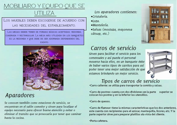 •Carro de flamear: tiene la mismas características que los dos anteriores, este cuenta con recipientes para el azúcar, mantequilla, licores, etc. Y la parte superior sirve para preparar platillos ala vista del cliente.