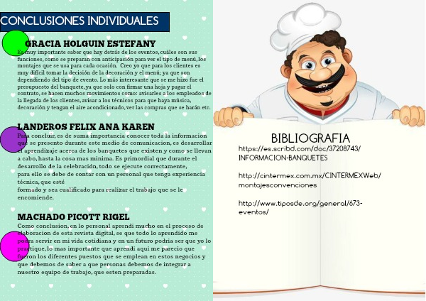 Para concluir, es de suma importancia conocer toda la informacion que se presento durante este medio de comunicacion, es desarrollar el aprendizaje acerca de los banquetes que existen y como se llevan a cabo, hasta la cosa mas minima. Es primordial que durante el desarrollo de la celebración, todo se ejecute correctamente,