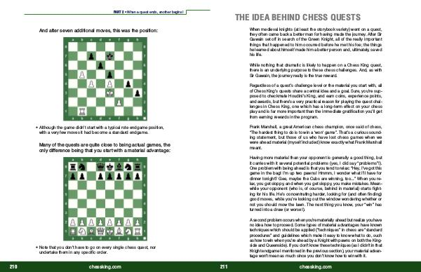 Regardless of a quest ' s challenge level or the material you start with, all of Chess King ' s quests share a central idea and a goal. Sure, you ' re supposed to checkmate Houdini ' s King, and earn coins, experience points, and awards, but there ' s a very practical reason for playing the quest challenges in Chess King, one which has a long-term effect on your chess play and is far more important than the immediate gratification you ' ll get from earning rewards in the program.