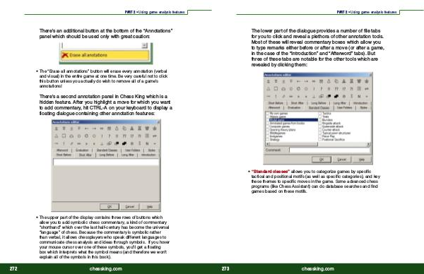 • The upper part of the display contains three rows of buttons which allow you to add symbolic chess commentary, a kind of commentary“ shorthand” which over the last half-century has become the universal“ language” of chess. Because the commentary is symbolic rather than verbal, it allows chessplayers who speak different languages to communicate chess analysis and ideas through symbols. If you hover your mouse cursor over one of these symbols, you ' ll get a floating box which interprets what the symbol means( and therefore we won ' t explain all of the symbols in this book).