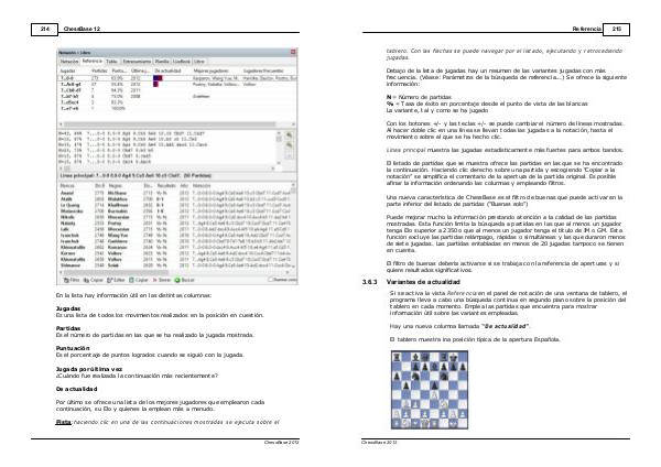 Si se activa la vista Re fe re nc ia en el panel de notación de una ventana de tablero, el programa lleva a cabo una búsqueda continua en segundo plano sobre la posición del tablero en cada momento. Emplea las partidas que encuentra para mostrar información útil sobre las variantes empleadas.