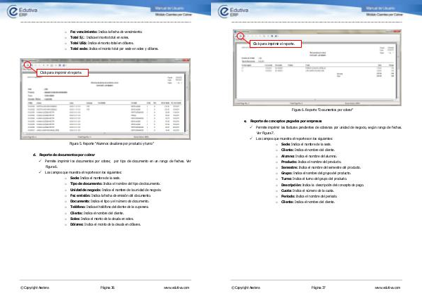 � Los campos que muestra el reporte son los siguientes: o Sede: Indica el nombre de la sede. o Tipo de documento: Indica el nombre del tipo de documento. o Unidad de negocio: Indica el nombre de la unidad de negocio. o Fec emisión: Indica la fecha de emisión del documento. o Documento: Indica el tipo y el número de documento. o Teléfono: Indica el teléfono del cliente de la cuponera. o Cliente: Indica el nombre del cliente. o Soles: Indica el monto de la deuda en soles. o Dólares: Indica el monto de la deuda en dólares.