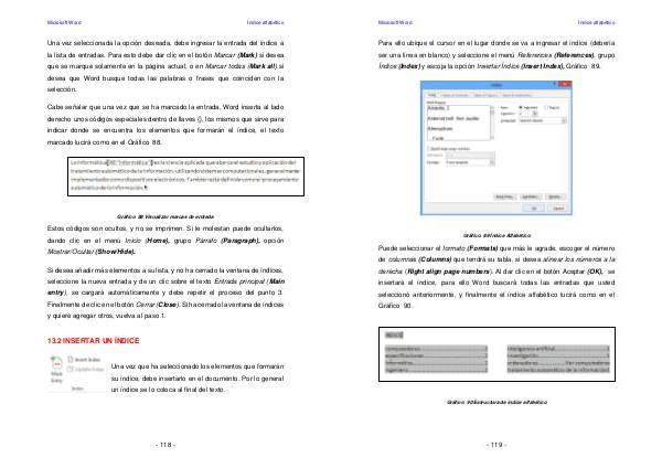 89 Índice Alfabético Puede seleccionar el formato( Formats) que más le agrade, escoger el número de columnas( Columns) que tendrá su tabla, si desea alinear los números a la derecha( Right align page numbers). Al dar clic en el botón Aceptar( OK), se insertará el índice, para ello Word buscará todas las entradas que usted seleccionó anteriormente, y finalmente el índice alfabético lucirá como en el Gráfico 90.