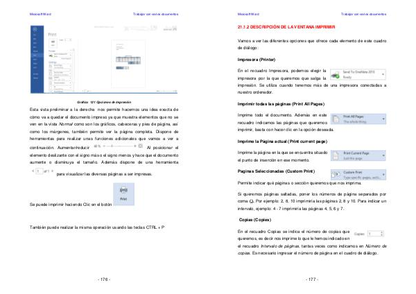 Gráfico 121 Opciones de impresión Esta vista preliminar a la derecha nos permite hacernos una idea exacta de cómo va a quedar el documento impreso ya que muestra elementos que no se ven en la vista Normal como son los gráficos, cabeceras y pies de página, así como los márgenes, también permite ver la página completa. Dispone de herramientas para realizar unas funciones adicionales que vamos a ver a