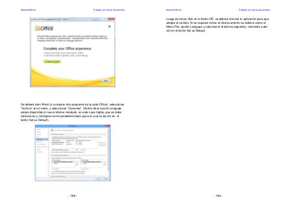 Se deberá abrir Word( o cualquier otro programa de la suite Office), seleccionar“ Archivo” en el menú, y seleccionar“ Opciones”. Dentro de la opción Lenguaje estará disponible el nuevo idioma instalado, en este caso Inglés, que se debe seleccionar y configurar como predeterminado( para lo cual se da clic en el botón Set as Default).
