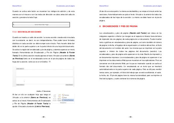 Cuando se inserta un salto de sección, la nueva sección creada está vinculada con la existente, es decir, no son independientes. Para poder tener formatos distintos en cada sección se debe romper este vínculo. Para hacerlo debe dar doble clic en la parte superior o en la parte inferior de una hoja del documento. Se activa la región del encabezado y pie de página, y además aparece un menú llamado Herramientas de Encabezado y Pie de Página( Header & Footer Tools). En la última sección creada aparece el texto Vincular a la anterior( Same as Previous) tanto en el encabezado como en el pie de página de todas las hojas de la sección, como se ve en el Gráfico 77.