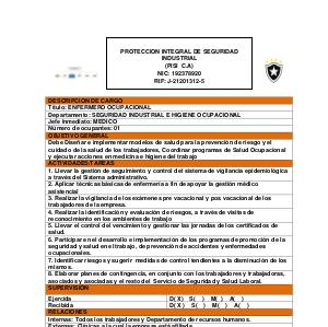 DESCRIPCION DE CARGO Título: ENFERMERO OCUPACIONAL Departamento: SEGURIDAD INDUSTRIAL E HIGIENE OCUPACIONAL Jefe Inmediato: MEDICO Número de ocupantes: 01 OBJETIVO GENERAL Debe Diseñar e implementar modelos de salud para la prevención de riesgo y el cuidado de la salud de los trabajadores, Coordinar programas de Salud Ocupacional y ejecutar acciones en medicina e higiene del trabajo ACTIVIDADES / TAREAS 1. Llevar la gestión de seguimiento y control del sistema de vigilancia epidemiológica a través del Sistema administrativo. 2. Aplicar técnicas básicas de enfermería a fin de apoyar la gestión médico asistencial 3. Realizar la vigilancia de los exámenes pre vacacional y pos vacacional de los trabajadores de la empresa. 4. Realizar la identificación y evaluación de riesgos, a través de visitas de reconocimiento en los ambientes de trabajo 5. Llevar el control del vencimiento y gestionar las jornadas de los certificados de salud. 6. Participar en el desarrollo e implementación de los programas de promoción de la seguridad y salud en el trabajo, de prevención de accidentes y enfermedades ocupacionales. 7. Identificar riesgos y sugerir medidas de control tendientes a la disminución de los mismos. 8. Elaborar planes de contingencia, en conjunto con los trabajadores y trabajadoras, asociados y asociadas y el resto del Servicio de Seguridad y Salud Laboral. SUPERVISIÓN
