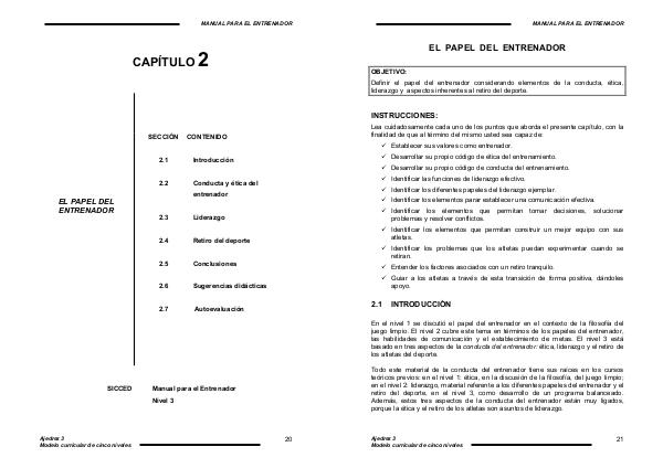 En el nivel 1 se discutió el papel del entrenador en el contexto de la filosofía del juego limpio. El nivel 2 cubre este tema en términos de los papeles del entrenador, las habilidades de comunicación y el establecimiento de metas. El nivel 3 está basado en tres aspectos de la conducta del entrenador: ética, liderazgo y el retiro de los atletas del deporte.