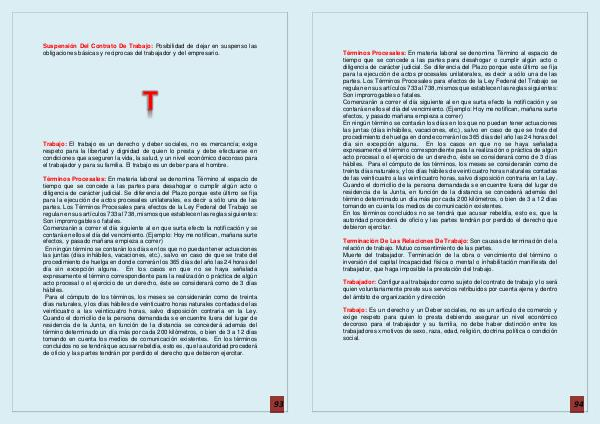 Términos Procesales: En materia laboral se denomina Término al espacio de tiempo que se concede a las partes para desahogar o cumplir algún acto o diligencia de carácter judicial. Se diferencia del Plazo porque este último se fija para la ejecución de actos procesales unilaterales, es decir a sólo una de las partes. Los Términos Procesales para efectos de la Ley Federal del Trabajo se regulan en sus artículos 733 al 738, mismos que establecen las reglas siguientes: Son improrrogables o fatales. Comenzarán a correr el día siguiente al en que surta efecto la notificación y se contará en ellos el día del vencimiento.( Ejemplo: Hoy me notifican, mañana surte efectos, y pasado mañana empieza a correr) En ningún término se contarán los días en los que no puedan tener actuaciones las juntas( días inhábiles, vacaciones, etc.), salvo en caso de que se trate del procedimiento de huelga en donde correrán los 365 días del año las 24 horas del día sin excepción alguna. En los casos en que no se haya señalada expresamente el término correspondiente para la realización o práctica de algún acto procesal o el ejercicio de un derecho, éste se considerará como de 3 días hábiles. Para el cómputo de los términos, los meses se considerarán como de treinta días naturales, y los días hábiles de veinticuatro horas naturales contadas de las veinticuatro a las veinticuatro horas, salvo disposición contraria en la Ley. Cuando el domicilio de la persona demandada se encuentre fuera del lugar de residencia de la Junta, en función de la distancia se concederá además del término determinado un día más por cada 200 kilómetros, o bien de 3 a 12 días tomando en cuenta los medios de comunicación existentes. En los términos concluidos no se tendrá que acusar rebeldía, esto es, que la autoridad procederá de oficio y las partes tendrán por perdido el derecho que debieron ejercitar.