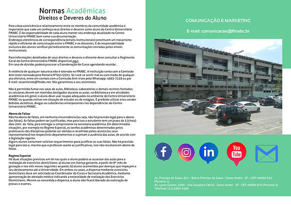 Para a boa convivência e relacionamento entre os membros da comunidade acadêmica é importante que cada um conheça seus direitos e deveres como aluno do Centro Universitário FMABC. É da responsabilidade de cada aluno manter seu endereço atualizado no Centro Universitário FMABC bem como sua documentação.