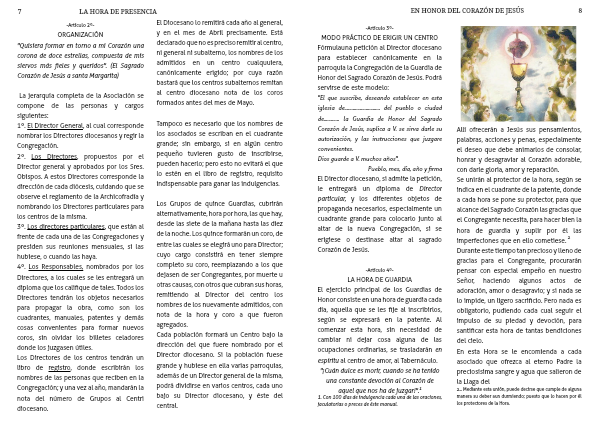 Los Grupos de quince Guardias, cubrirán alternativamente, hora por hora, las que hay, desde las siete de la mañana hasta las diez de la noche. Los quince formarán un coro, de entre las cuales se elegirá uno para Director; cuyo cargo consistirá en tener siempre completo su coro, reemplazando a los que dejasen de ser Congregantes, por muerte u otras causas, con otros que cubran sus horas, remitiendo al Director del centro los nombres de los nuevamente admitidos, con nota de la hora y coro a que fueron agregados.