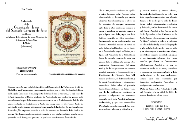 Hásenos expuesto que en la Iglesia pública del Monasterio de la Visitación de la villa de Madrid hay una Congregación, canónicamente instituida, con el título de Guardia de Honor del Sagrado Corazón de Jesús, compuesta de fieles de uno y otro sexo, a la cual concedió la Sede Apostólica el título y privilegios de Archicofradía, con facultad de agregar a ella tan solamente lasque de la misma advocación existan en la Archidiócesisde Toledo. Mas ahora, constando por la súplica que a Nos ha sido hecha, como los Directores y Socios de esta Archicofradía desean ardientemente que usando de la plenitud de nuestra autoridad Apostólica, Nos dignámos extender a todos los dominios de España la dicha facultad de agregar, Nos hemos creído conveniente acceder a esta piadosa petición, cuanto nos es permitido en el Señor, para que tenga mayor honor esta fructuosa Archicofradía.