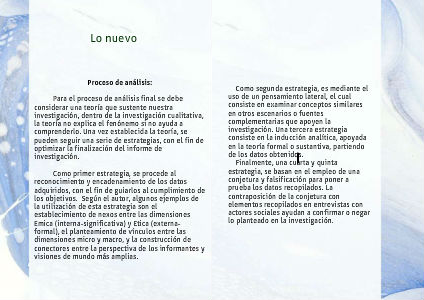 Como segunda estrategia, es mediante el uso de un pensamiento lateral, el cual consiste en examinar conceptos similares en otros escenarios o fuentes complementarias que apoyen la investigación. Una tercera estrategia consiste en la inducción analítica, apoyada en la teoría formal o sustantiva, partiendo de los datos obtenidos.