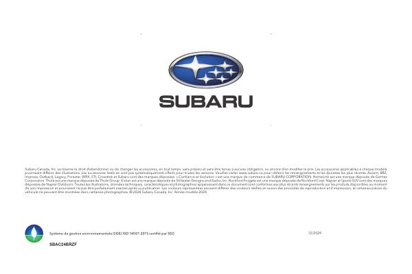 Subaru Canada , Inc . se réserve le droit d ’ abandonner ou de changer les accessoires , en tout temps , sans préavis et sans être tenue à aucune obligation , ou encore d ’ en modifier le prix . Les accessoires applicables à chaque modèle pourraient différer des illustrations . Les accessoires listés ne sont pas systématiquement offerts pour toutes les versions . Veuillez visiter www . subaru . ca pour obtenir les renseignements et les données les plus récents . Ascent , BRZ , Impreza , Outback , Legacy , Forester , WRX , STI , Crosstrek et Subaru sont des marques déposées . « Confiance et évolution » est une marque de commerce de SUBARU CORPORATION . HomeLink est une marque déposée de Gentex Corporation . Thule est une marque déposée de Thule Group . Kicker est une marque déposée de Stillwater Designs and Audio , Inc . Rockford Fosgate est une marque déposée de Rockford Corp . Napier et Sportz SUV sont des marques déposées de Napier Outdoors . Toutes les illustrations , données techniques , caractéristiques et photographies apparaissant dans ce document sont conformes aux plus récents renseignements sur les produits disponibles au moment de son impression et pourraient ne pas être parfaitement exactes après sa publication . Les couleurs représentées peuvent différer des couleurs réelles en raison des procédés de reproduction et d ’ impression , et certaines pièces du véhicule ne peuvent être montrées dans certaines photographies . © 2024 Subaru Canada , Inc . Année modèle 2024 .