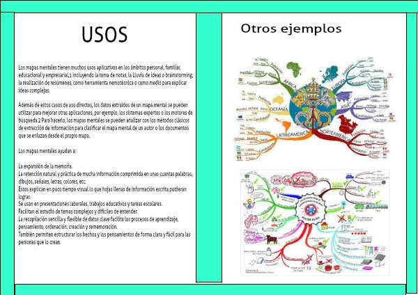 Los mapas mentales tienen muchos usos aplicativos en los ámbitos personal, familiar, educacional y empresarial,1 incluyendo la toma de notas, la Lluvia de ideas o brainstorming, la realización de resúmenes, como herramienta nemotécnica o como medio para explicar ideas complejas.