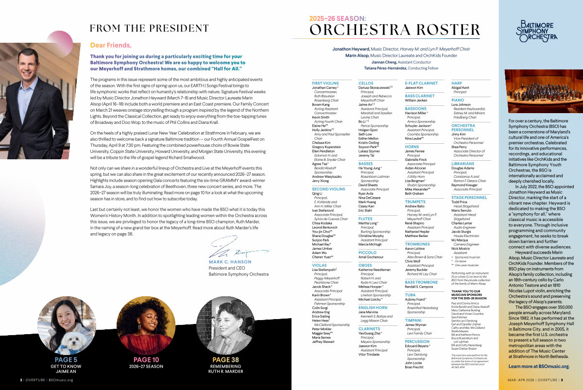 Last but certainly not least, we honor the women who have made the BSO what it is today this Women’ s History Month. In addition to spotlighting leading women within the Orchestra across this issue, we are privileged to honor the legacy of a long-time BSO champion, Ruth Marder, in the naming of a new grand tier box at the Meyerhoff. Read more about Ruth Marder’ s life and legacy on page 38.