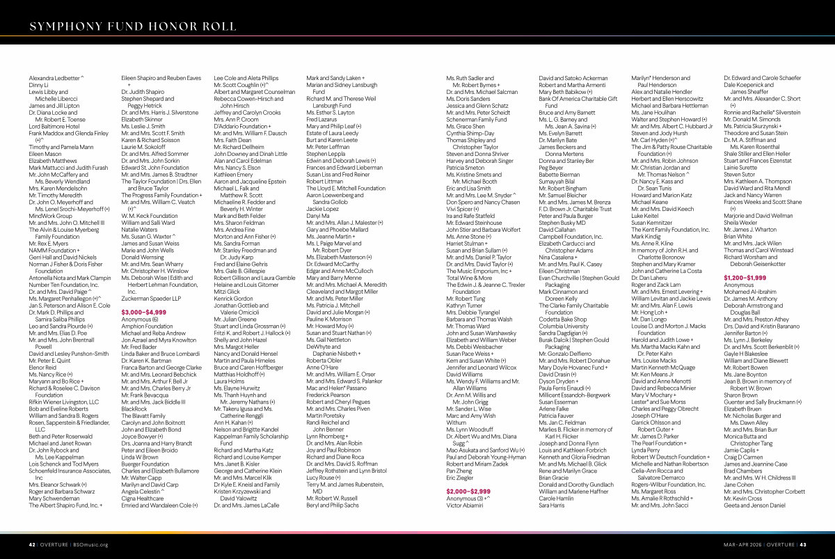 $ 3,000 ā$ 4,999 Anonymous( 6) Amphion Foundation Michael and Reba Andrew Jon Azrael and Myra Knowlton Mr. Fred Bader Linda Baker and Bruce Lombardi Dr. Karen K. Bartman Franca Barton and George Clarke Mr. and Mrs. Leonard Bebchick Mr. and Mrs. Arthur F. Bell Jr Mr. and Mrs. Charles Berry Jr Mr. Frank Bevacqua Mr. and Mrs. Jack Biddle III BlackRock The Blavatt Family Carolyn and John Boitnott John and Elizabeth Bond Joyce Bowyer(+) Drs. Joanna and Harry Brandt Peter and Eileen Broido Linda W Brown Buerger Foundation Charles and Elizabeth Bullamore Mr. Walter Capp Marilyn and David Carp Angela Celestin ^ Cigna Healthcare Emried and Wandaleen Cole(+)