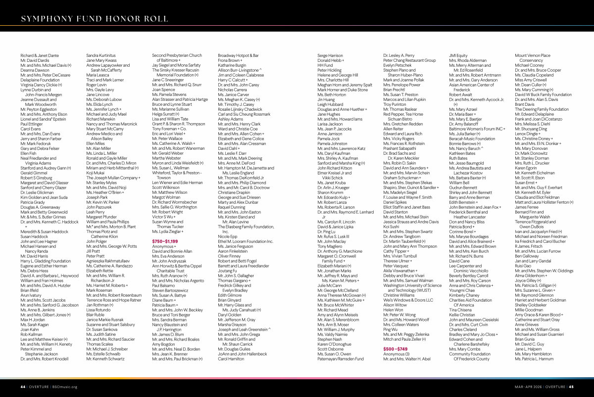 Dr. Karen Meckler Mrs. Robin D. Sakin David and Ann Saunders + Mr. and Mrs. Marvin Schein Graham Schuckman + Mr. and Mrs. Stephen Sfekas Shapiro, Sher, Guinot & Sandler + Ms. Madelyn Siegel F. Louise and Wayne F. Smith Daniel Spikes Elliot Staffin and Janet Bass David Stanton Mr. and Mrs. Michael Stein Jessica Strauss and Andre Davis Koi Sushi Mr. and Mrs. Stephen Swartz Dr. Andrew Tangborn Dr. Martin Taubenfeld(+) John and Mary Ann Thompson Cathy Tipper + Mrs. Vivian Turnbull Therese Ulmer + Peter Vasquez Akila Viswanathan + Debby and Bruce Vivari Mr. and Mrs. Samuel Walman Washington University of Science and Technology( WUST) Christine Williams Wei’ s Windows & Doors LLC Alison Witow Helen Won Mr. Peter W. Wong Dr. and Ms. Howard Woolf Mrs. Colleen Waters Ping Wu Ms. and Mr. Peggy Zelenka Mitch and Paula Zeller(+)