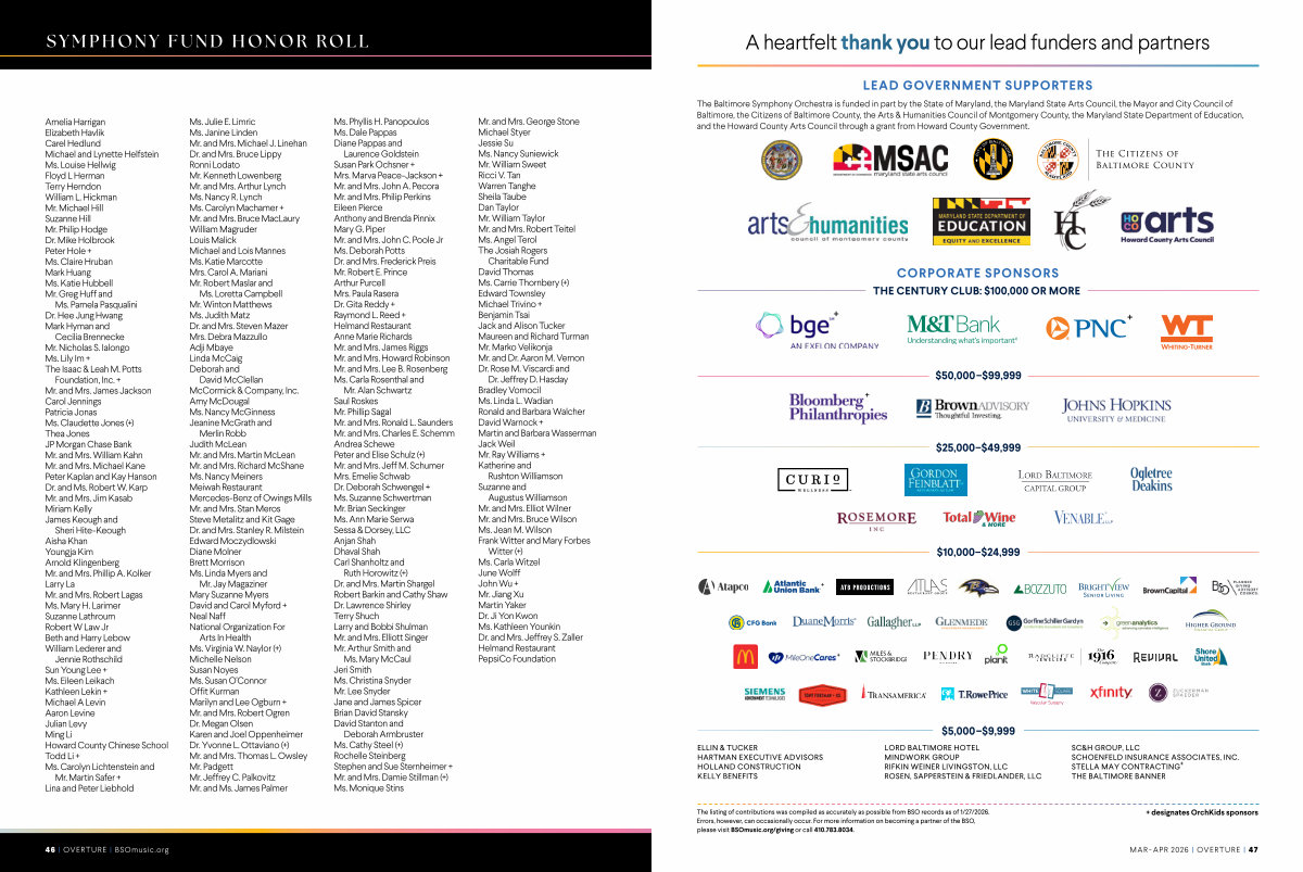 The listing of contributions was compiled as accurately as possible from BSO records as of 1 / 27 / 2026. Errors, however, can occasionally occur. For more information on becoming a partner of the BSO, please visit BSOmusic. org / giving or call 410.783.8034.