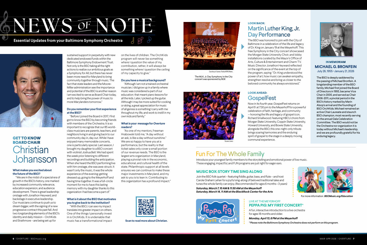 “ We are in the midst of a special era of growth in the BSO’ s history, one marked by increased community relevance, education expansion, and audience development. There is great leadership onstage with Jonathon Heyward, and backstage in executive leadership. Our musicians continue to push us to dream bigger, with the signing of a new progressive contract this past fall. And two longstanding elements of the BSO’ s identity and daily mission – OrchKids and Strathmore – are being set up for sustained support in perpetuity with new dedicated endowed funds within the Baltimore Symphony Endowment Trust. Not only is the BSO taking all the right actions to realize our ambitious goals as a Symphony for All, but there has never been more need for Maryland to bring community together through music. The fact that state leaders and the Moore- Miller administration see the importance and potential of the BSO is another reason I am excited to serve as Board Chair today, and to help bring the power of music to more Marylanders tomorrow.”