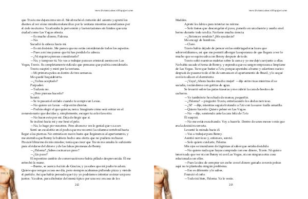 Se levantó sobre las patas traseras y me cubrió la cara de besitos de cachorro.— Yo también te he echado de menos, pequeñín.—¿ Paloma?— preguntó Travis, entrelazando los dedos nervioso.—¿ Sí?— dije, mientras seguía frotando a Toto con la suave toalla amarilla.— Quiero hacerlo. Quiero pelear en Las Vegas.— No— dije, sonriendo ante la cara feliz de Toto. Él suspiró.— No me estás escuchando. Voy a hacerlo. Dentro de unos meses verás que era la decisión correcta. Levanté la mirada hacia él.— Vas a trabajar para Benny. Asintió nervioso y, entonces, sonrió.— Solo quiero cuidarte, Paloma. Mis ojos se inundaron de lágrimas al saber que estaba decidido.— No quiero nada que hayas comprado con ese dinero, Travis. Ni quiero tener nada que ver ni con Benny ni con Las Vegas, ni con ninguna otra cosa relacionada con ellos.