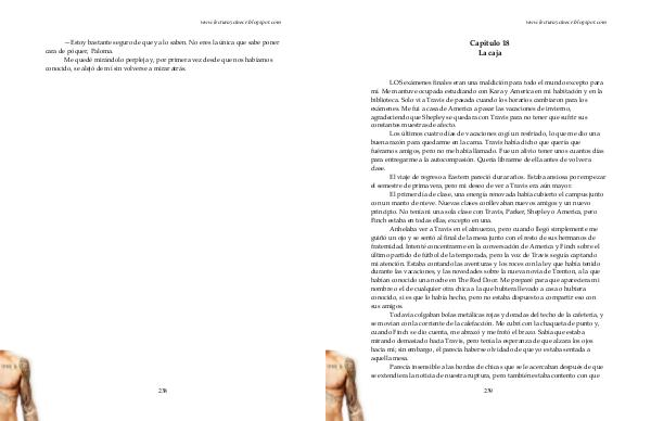 Anhelaba ver a Travis en el almuerzo, pero cuando llegó simplemente me guiñó un ojo y se sentó al final de la mesa junto con el resto de sus hermanos de fraternidad. Intenté concentrarme en la conversación de America y Finch sobre el último partido de fútbol de la temporada, pero la voz de Travis seguía captando mi atención. Estaba contando las aventuras y los roces con la ley que había tenido durante las vacaciones, y las novedades sobre la nueva novia de Trenton, a la que habían conocido una noche en The Red Door. Me preparé para que apareciera mi nombre o el de cualquier otra chica a la que hubiera llevado a casa o hubiera conocido, si es que lo había hecho, pero no estaba dispuesto a compartir eso con sus amigos.