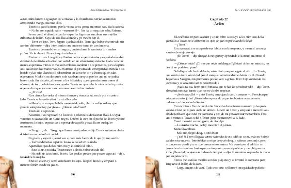— Tengo …, eh … Tengo que llamar a mi padre— dijo Travis, mientras abría el teléfono con el ceño fruncido. Cogí aire y esperé que mi voz sonara más fuerte de lo que yo me sentía.— Tal vez deberías esperar. Todavía no sabemos nada. Apartó los ojos de los números y le tembló el labio.— Esto es una mierda. Trent nunca debería haber estado ahí.— Ha sido un accidente, Travis. No podías prever que pasara algo así— dije, tocándole la mejilla. Frunció el ceño y cerró con fuerza los ojos. Respiró hondo y empezó a marcar el número de su padre.