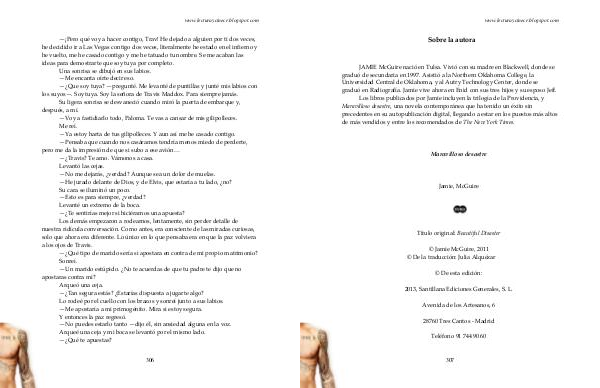 —¡ Pero qué voy a hacer contigo, Trav! He dejado a alguien por ti dos veces, he decidido ir a Las Vegas contigo dos veces, literalmente he estado en el infierno y he vuelto, me he casado contigo y me he tatuado tu nombre. Se me acaban las ideas para demostrarte que soy tuya por completo. Una sonrisa se dibujó en sus labios.— Me encanta oírte decir eso.—¿ Que soy tuya?— pregunté. Me levanté de puntillas y junté mis labios con los suyos—. Soy tuya. Soy la señora de Travis Maddox. Para siempre jamás. Su ligera sonrisa se desvaneció cuando miró la puerta de embarque y, después, a mí.— Voy a fastidiarlo todo, Paloma. Te vas a cansar de mis gilipolleces. Me reí.— Ya estoy harta de tus gilipolleces. Y aun así me he casado contigo.— Pensaba que cuando nos casáramos tendría menos miedo de perderte, pero me da la impresión de que si subo a ese avión …—¿ Travis? Te amo. Vámonos a casa. Levantó las cejas.— No me dejarás, ¿ verdad? Aunque sea un dolor de muelas.— He jurado delante de Dios, y de Elvis, que estaría a tu lado, ¿ no? Su cara se iluminó un poco.— Esto es para siempre, ¿ verdad? Levanté un extremo de la boca.—¿ Te sentirías mejor si hiciéramos una apuesta? Los demás empezaron a rodearnos, lentamente, sin perder detalle de nuestra ridícula conversación. Como antes, era consciente de las miradas curiosas, solo que ahora era diferente. Lo único en lo que pensaba era en que la paz volviera a los ojos de Travis.—¿ Qué tipo de marido sería si apostara en contra de mi propio matrimonio? Sonreí.— Un marido estúpido. ¿ No te acuerdas de que tu padre te dijo que no apostaras contra mí? Arqueó una ceja.—¿ Tan segura estás? ¿ Estarías dispuesta a jugarte algo? Lo rodeé por el cuello con los brazos y sonreí junto a sus labios.— Me apostaría a mi primogénito. Mira si estoy segura. Y entonces la paz regresó.— No puedes estarlo tanto— dijo él, sin ansiedad alguna en la voz. Arqueé una ceja y mi boca se levantó por el mismo lado.—¿ Qué te apuestas?